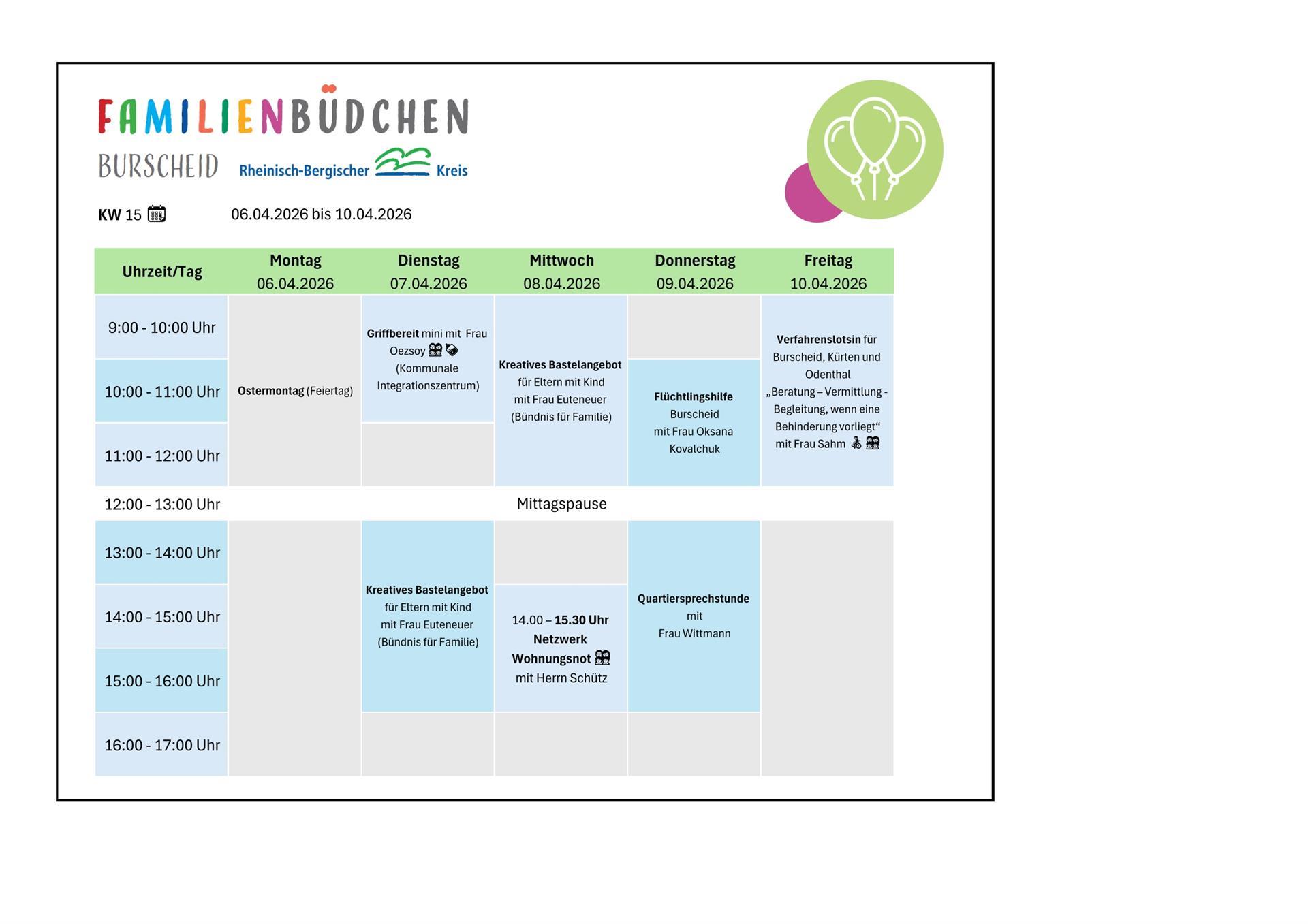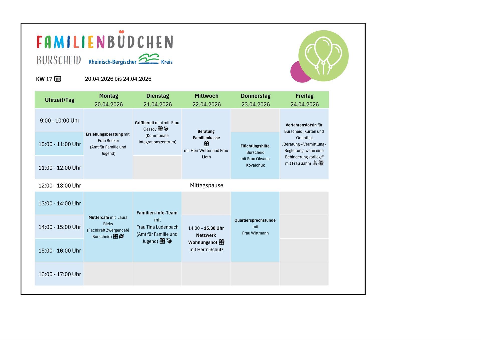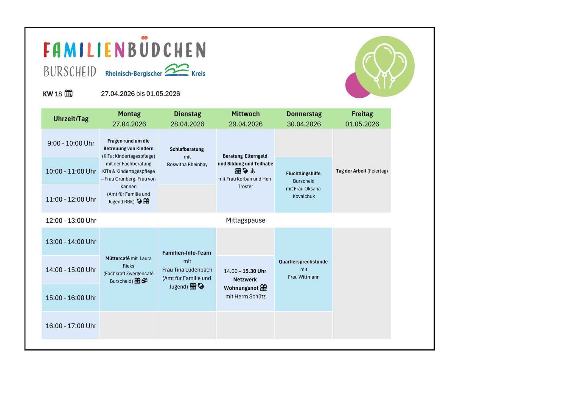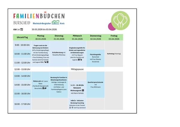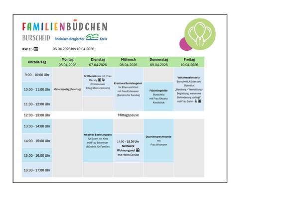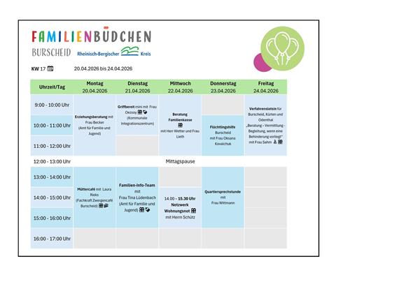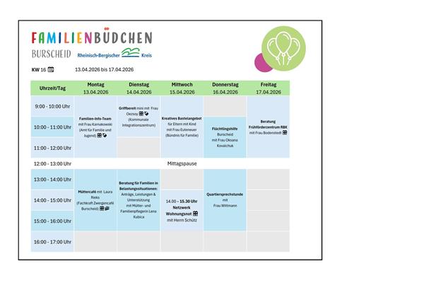 Das Burscheider Familienbüdchen ist ein niedrigschwelliges Kontakt- und Beratungsangebot, in dem Eltern eine zentrale Anlaufstelle für verschiedenen Fragen rund um das Leben mit Baby und dem Alltag mit Kind erhalten. Neben der passgenauen Unterstützung und Beratung durch Fachkräfte bietet das Büro die Möglichkeit, dass sich die Eltern kennenlernen und in einer angenehmen Atmosphäre austauschen.